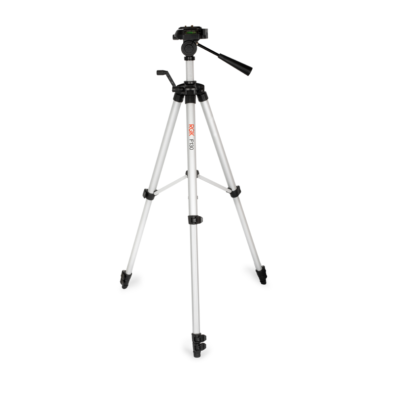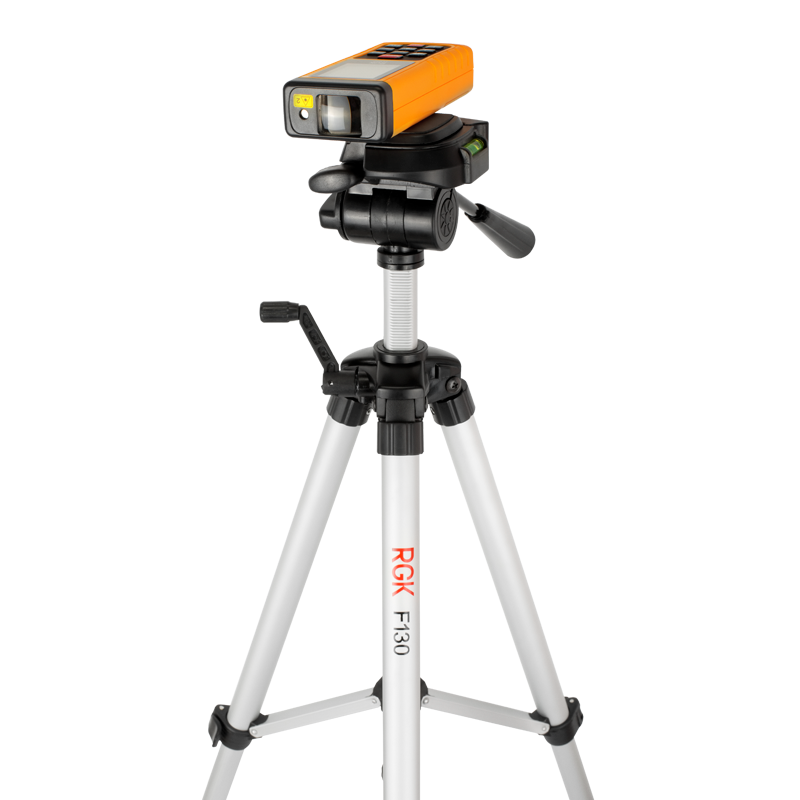Отдельная рукоятка элевационного штатива RGK F130 позволяет наклонять нивелир или дальномер под углом для проведения таких работ, как отделка лестничных маршей или установка перил. При работе с лазерным дальномером наклонная головка значительно облегчает наведение на точку и обеспечивает стабильность измерений. За корректность позиционирования отвечает встроенный в площадку пузырьковый уровень.