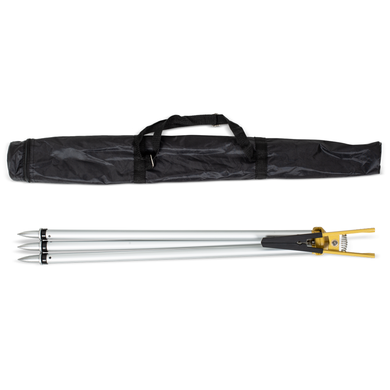 Веха устанавливается на верхнюю часть устройства с помощью прищепки. Приспособление подходит для использования с любыми типами вех диаметром от 25 до 38 мм.