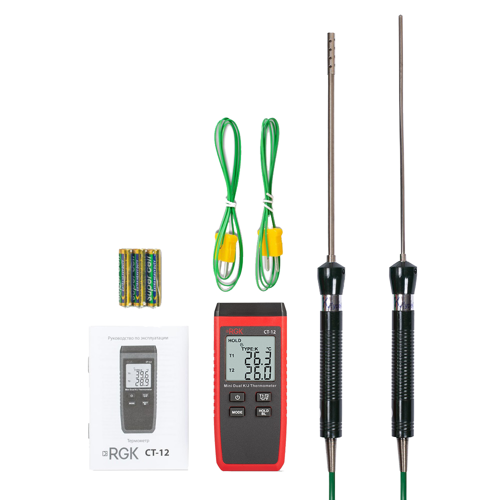Специальная индикация оповещает специалиста о ненадлежащем подключении или неисправности термопары. Двухканальный цифровой термометр RGK CT-12 с зондом температуры воздуха TR-10A и погружным зондом температуры TR-10W также сообщает о превышении предела измерений и низком уровне заряда элементов питания. Измерение пиковой и средней температуры упрощает реализацию различных сценариев проверки, особенно при работе с крупными объектами.