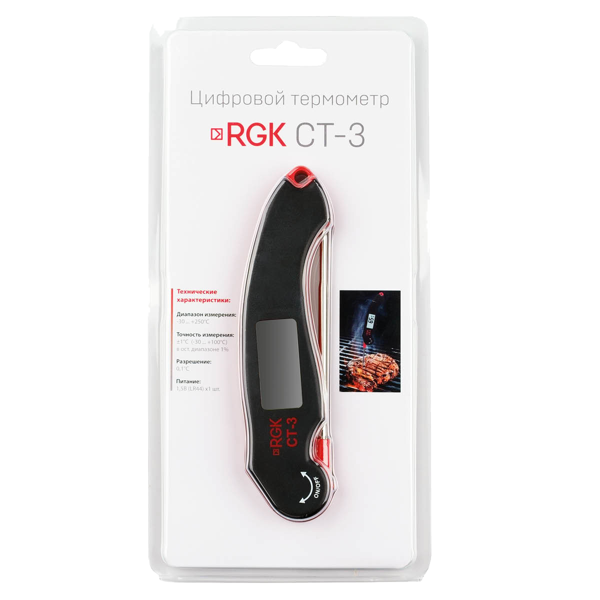 Кулинарным термометром RGK CT-3 можно измерять температуру в диапазоне от -30 °С до 250 °С. Таким образом пользователь может контролировать как сам процесс приготовления, жарку или запекание, так и инспектировать замороженное сырье.