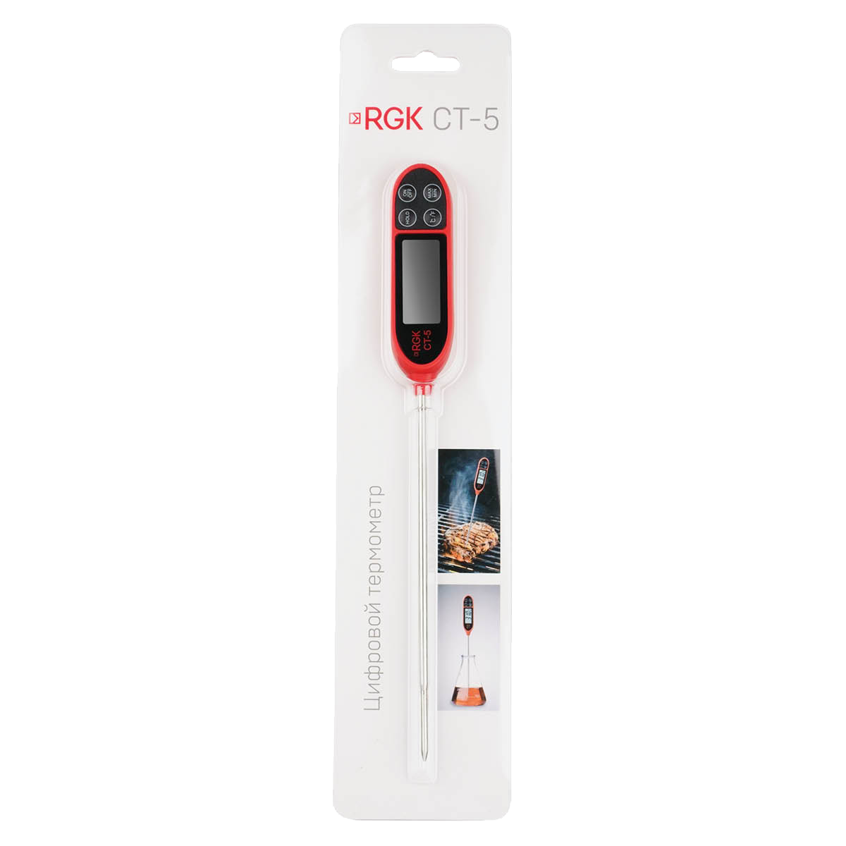 Устройство оборудовано большим дисплеем, на котором крупными цифрами отображается показатель температуры. Важное преимущество кулинарного термометра RGK CT-5 - изображение остается четким и ярким даже при низком уровне заряда батареи. Поскольку элемент питания включен в комплект, эта модель готова к измерениям прямо из коробки. Благодаря низкому энергопотреблению беспокоиться о замене батареи придется нечасто.