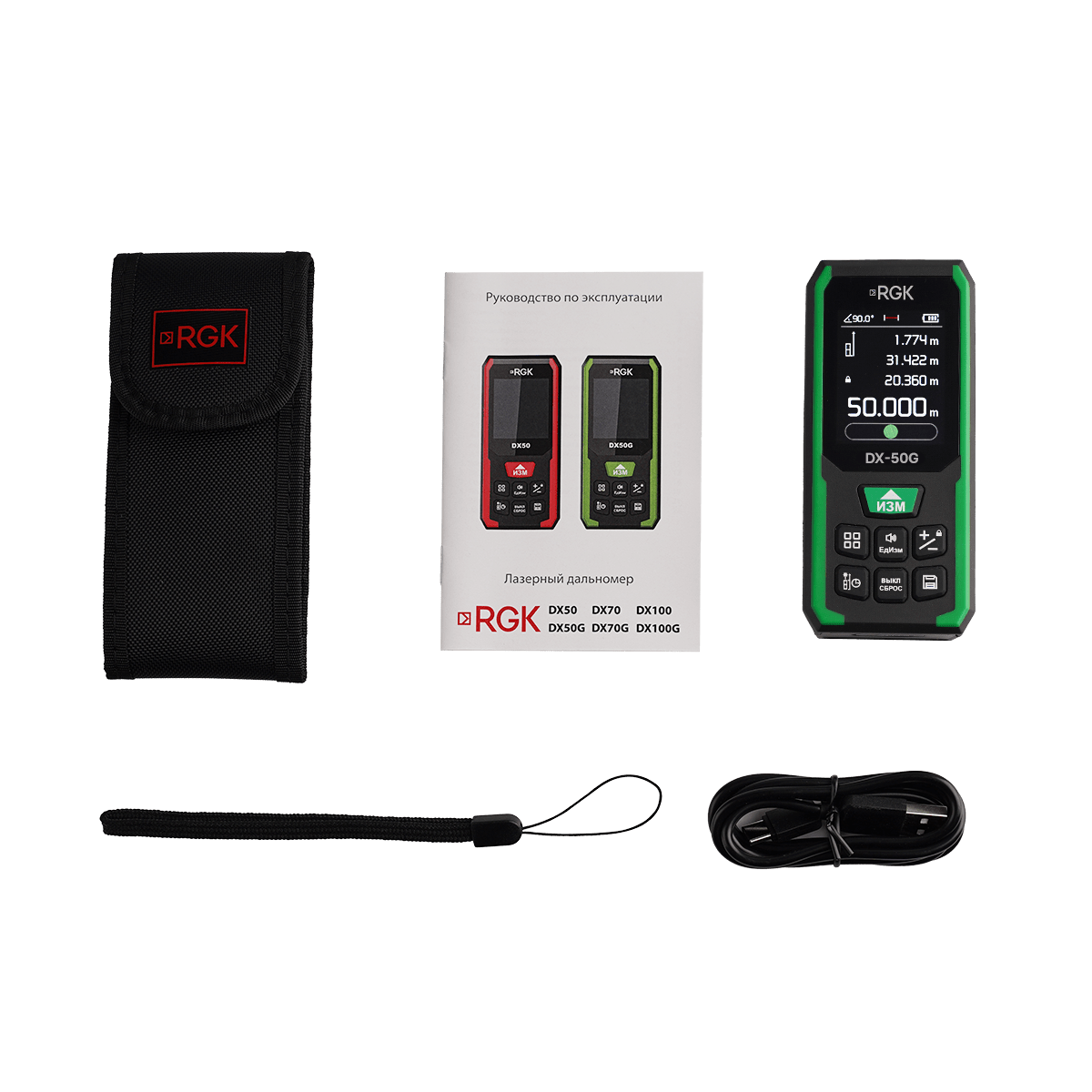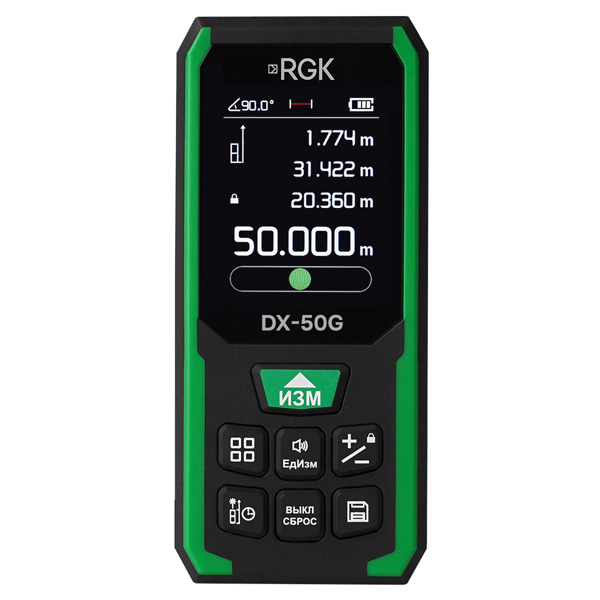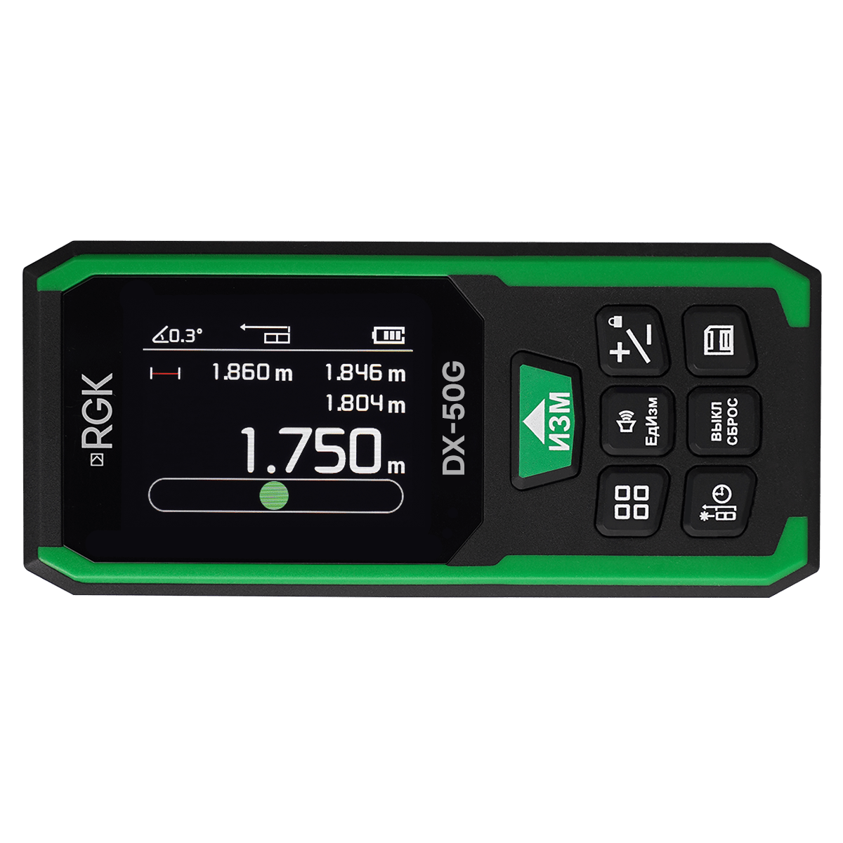 Лазерный дальномер RGK DX-50G представляет собой профессиональный измерительный инструмент, разработанный для строительной отрасли, оборудованный зеленым излучателем, маркер которого хорошо различим на ярком солнце, что упрощает наведение. Прибор позволяет дистанционно определять линейные размеры и расстояния до выбранных объектов в диапазоне до 50 м с 1,5-миллиметровой точностью, а наличие встроенного инклинометра дает возможность одновременно фиксировать угол наклона изделия. Особенностью рулеток серии DX является использование для отображения данных 2-дюймового графического IPS-дисплея, с инверсным изображением и функцией автоматического поворота изображения, что упрощает снятие показаний.