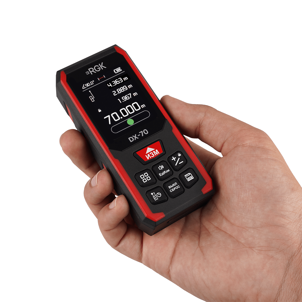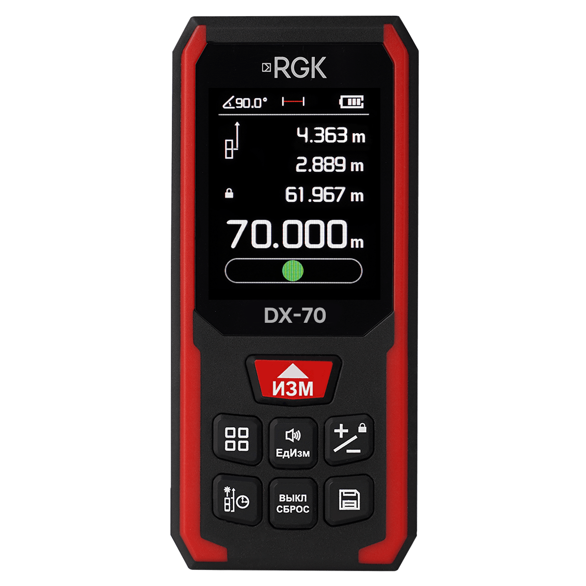 Лазерный дальномер RGK DX70 – профессиональный измерительный инструмент компактного класса с расширенной функциональностью, предназначенный для использования на дистанциях до 70 м. Прибор снабжен цветным графическим дисплеем, внутренней памятью для документирования показаний и оборудован встроенным инклинометром, благодаря чему способен определять не только линейные расстояния до выбранных объектов, но и контролировать угол наклона линии визирования. Помимо прямых и косвенных измерений и вычислений, он поддерживает режим разбивки по точкам, что упрощает выполнение разметочных работ.
