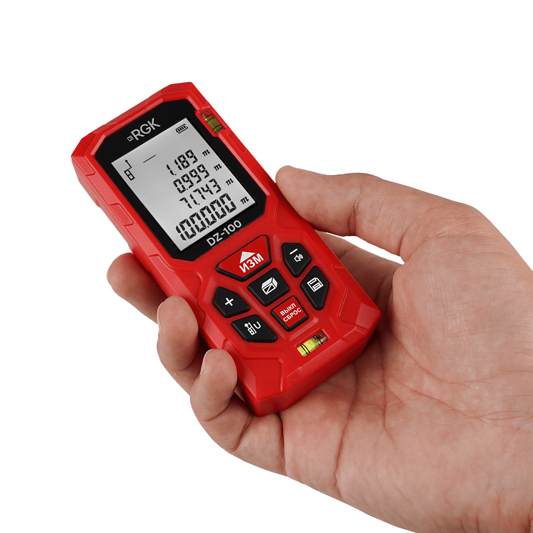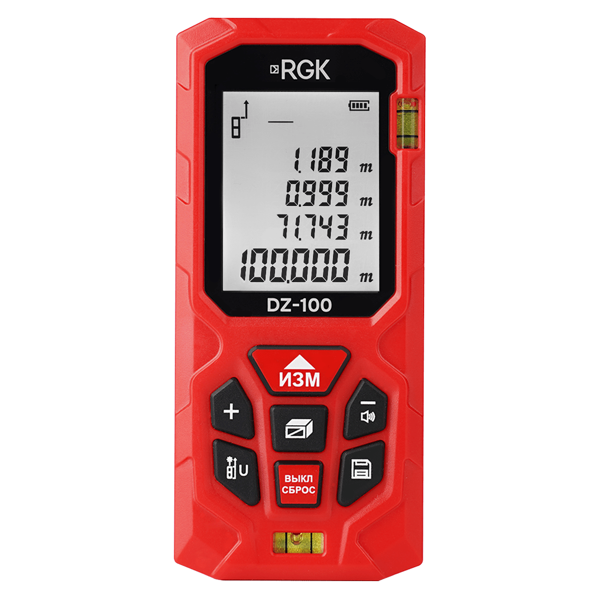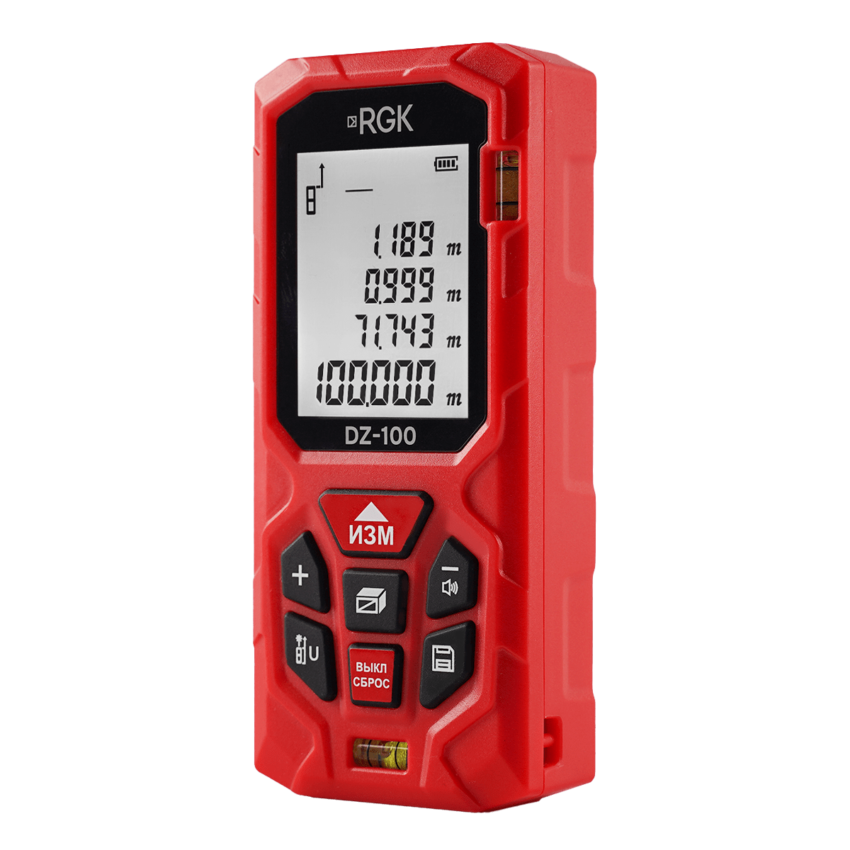 Лазерный дальномер RGK DZ-100 относится к портативным приборам для дистанционного определения расстояний профессионального класса, позволяя выполнять замеры в диапазоне до 100 м с погрешностью, не превышающей ±2 мм. Поддерживая такой же перечень базовых функций по линейным измерениям и вычислениям, как изделия линейки DL данного бренда, инструмент обладает более доступной ценой. Вместо внутреннего инклинометра, он оборудуется пузырьковыми уровнями цилиндрической формы на передней панели, размещенными перпендикулярно друг к другу в продольном и поперечном направлении, которые служат для контроля правильности положения измерителя при определении горизонтальных и вертикальных расстояний.
