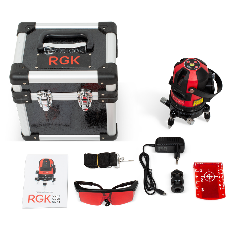 RGK UL-21 – это профессиональный лазерный нивелир, проецирующий три взаимно перпендикулярных плоскости: две вертикальных и одну горизонтальную с углом развёртки составляет 150°. Увеличенное число плоскостей сокращает число перестановок, а поворотный корпус с горизонтальным лимбом и двумя наводящими винтами позволяет с высокой точностью навести вертикальную плоскость или переместить горизонтальную на определённый угол.