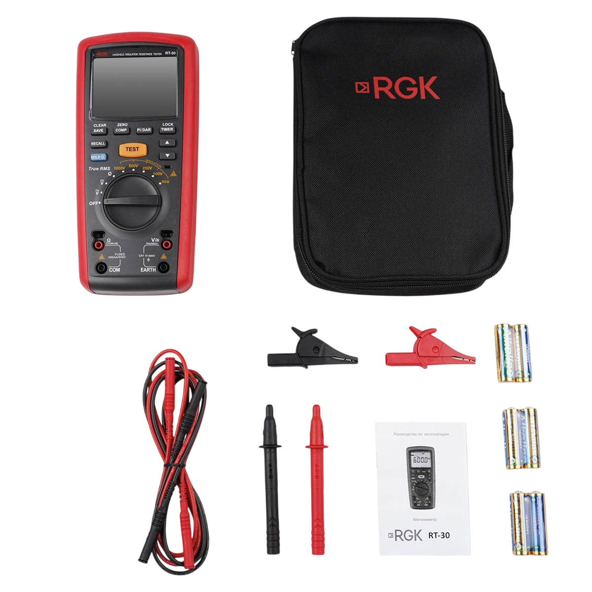 Принцип работы измерителя сопротивления изоляции RGK RT-30 заключается в генерации и подаче напряжения на предмет исследования. По итогу определяется утечка тока и значение сопротивления между 2 щупами или зажимами. Функционал устройства дополнен режимом вольтметра, что упрощает комплексные проверки электрооборудования.
