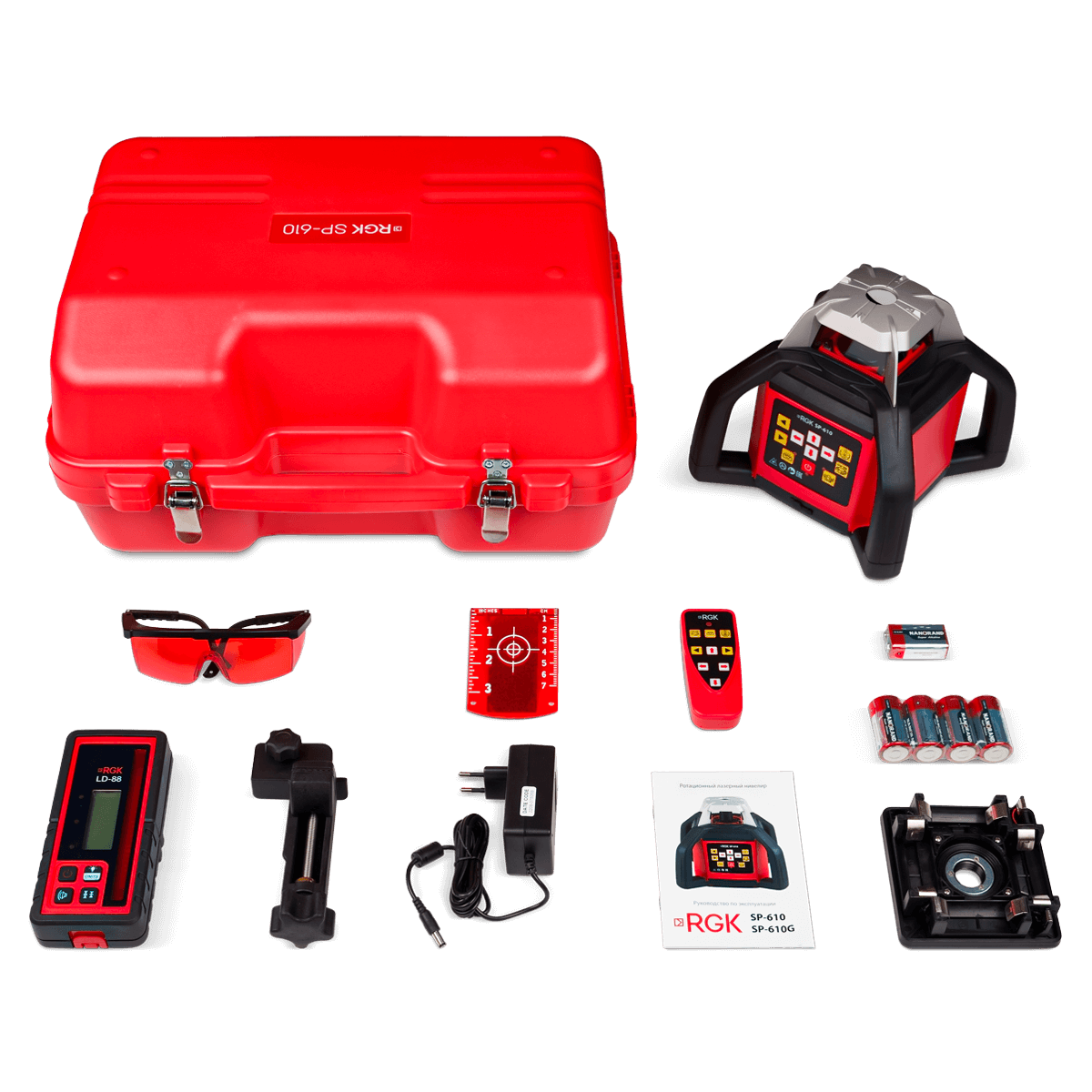 Комплектация: Ротационный уровень RGK SP 610, пластиковый кейс, приёмник излучения, пульт ДУ, зарядное устройство, кронштейн, слот для батареек, мишень, очки, батарейки, аккумуляторная батарея.