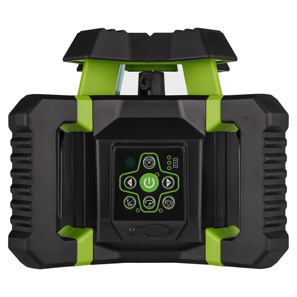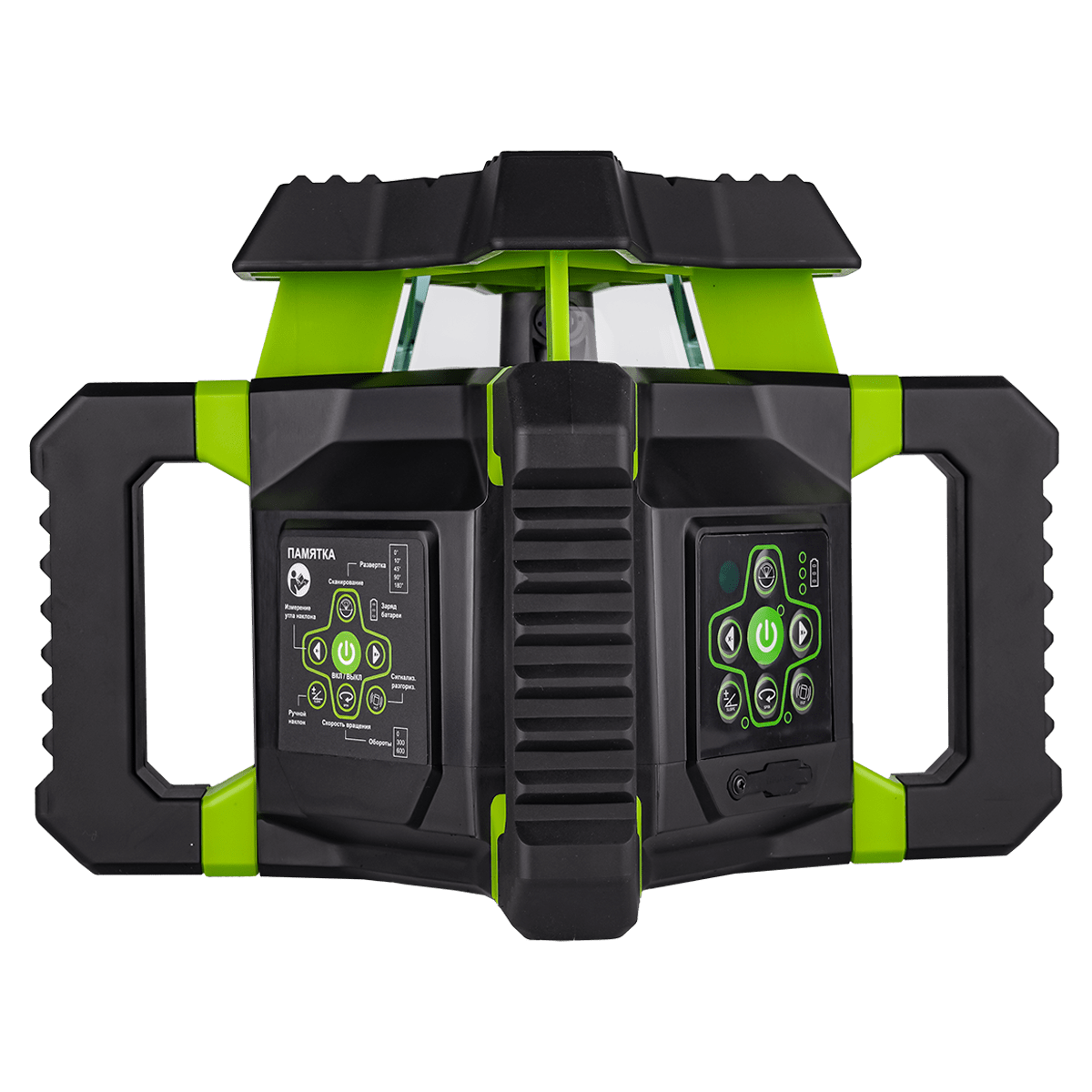 - 4 боковые ручки, благодаря параллельному расположению, позволяют устанавливать ротационный нивелир на любых горизонтальных поверхностях для проецирования отвесной плоскости при боковом выравнивании, исключая необходимость обязательного задействования штатива.