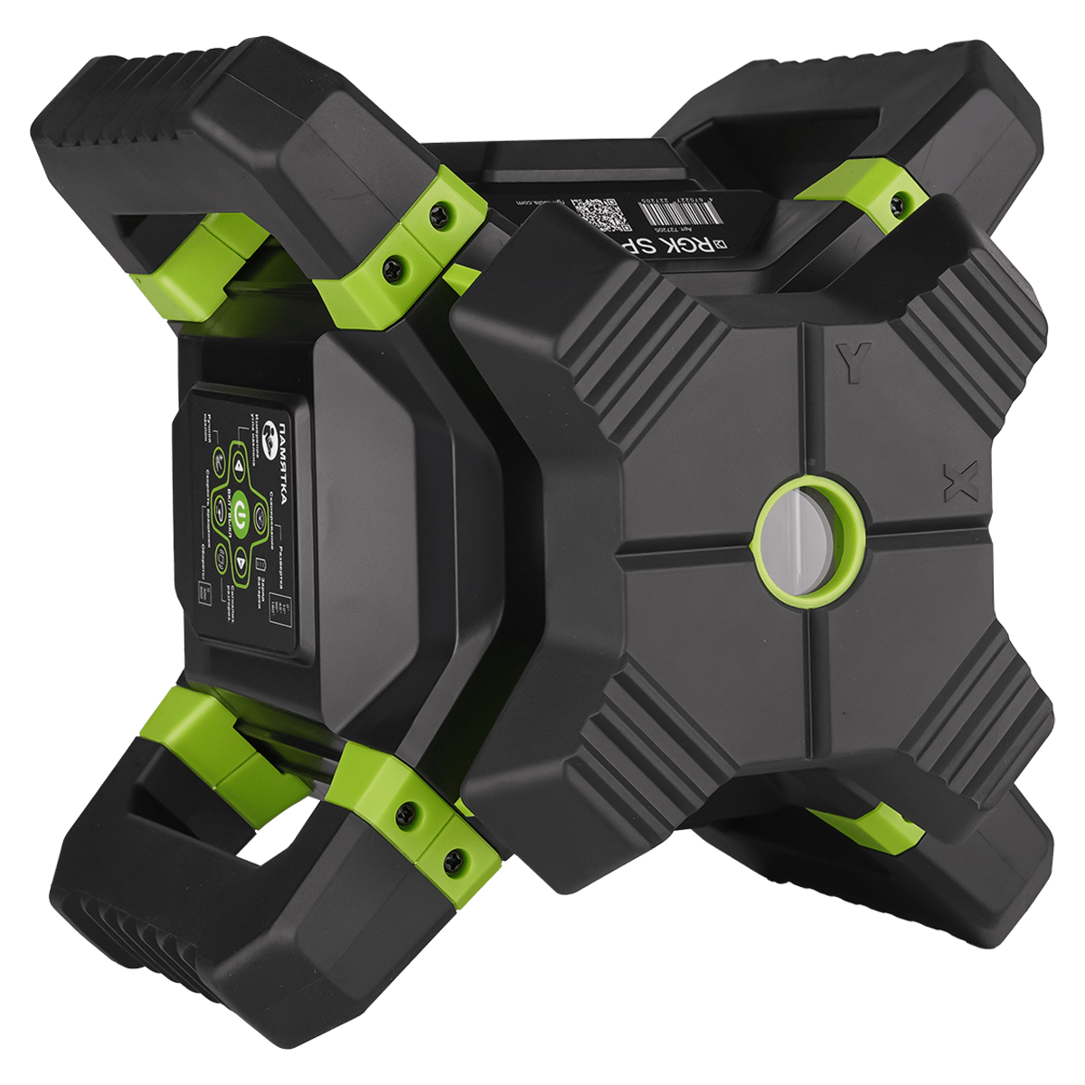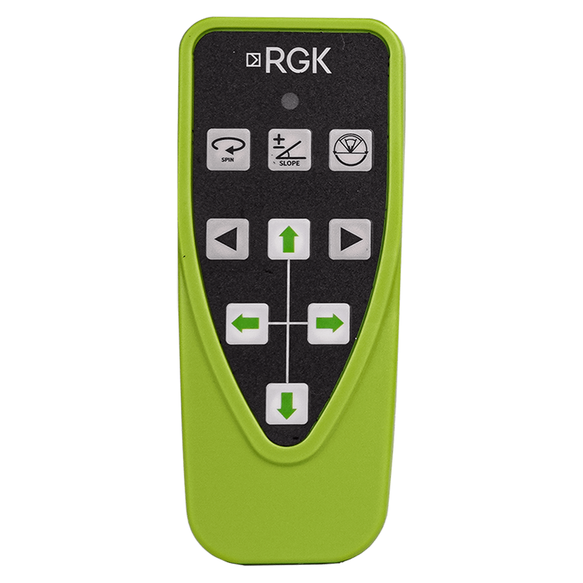 - Пульт дистанционного управления, который полностью дублирует функции кнопок на панели прибора, дает возможность удаленно изменять направление и скорость вращения ротационной системы, устанавливать ширину сектора проецируемой плоскости и задавать требуемый уклон по осям X и Y.